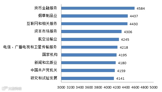 从行业中类平均月薪看,最高的是货币金融服务,为4584元,其次是烟草制造业,为4437元,第三是互联网和有关服务,为4430元。