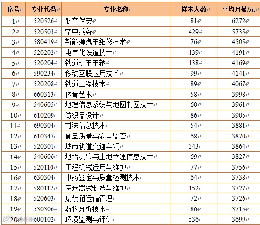 从国家设置的标准专业(统计样本在50人及50人以上)看,平均月薪最高的是航空保安,为6272元,其次是空中乘务,为5735元,第三是新能源汽车维修技术,为4505元。