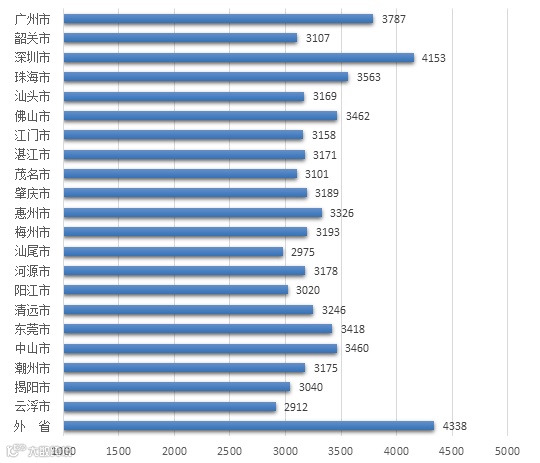 在广东省内就业地区中,平均月薪最高的是深圳市,为4153元,其次是广州市,为3787元。较低的分别是云浮市(2912元)、汕尾市(2975元)。