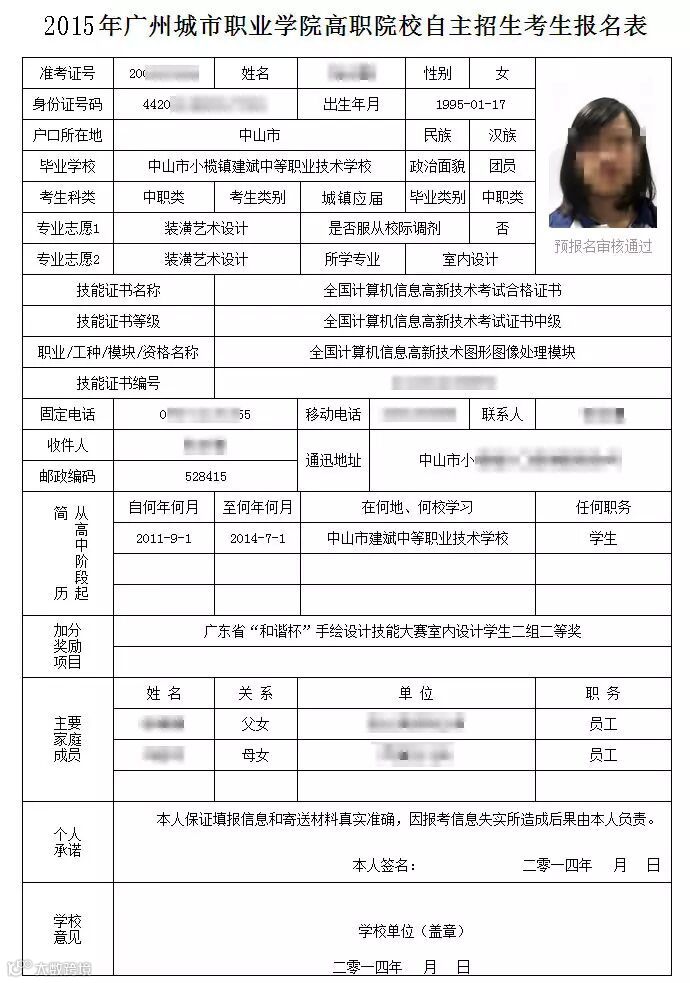 2、《2016年广州城市职业学院高职院校自主招生报名表》(报名系统打印)