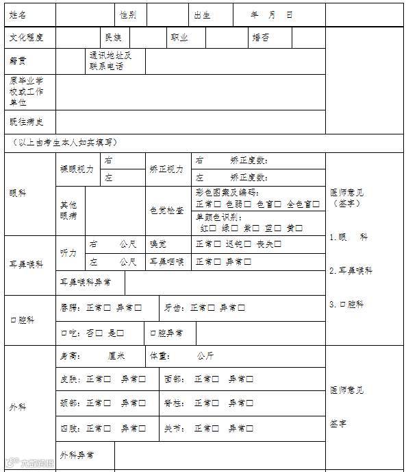注:1.“既往病史”一栏考生必须如实填写。如发现有隐瞒严重疾病,不符合体检标准的,即使已录取入学,也必须取消入学资格。
