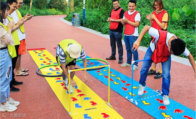 游戏规则很简单,每个小组根据地上图型指示,用双手及双脚踩或用手按在指定位置,同时按要求完成指定动作,计算全组成绩,所有成员完成项目时间最短的为优胜组别。