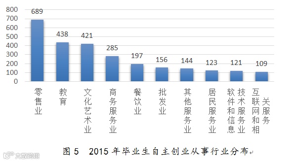 2015年自主创业毕业生中,选择零售业创业的毕业生最多,有689人,占自主创业毕业生人数的18.77%;其次是教育,有438人,占11.93%;第三是文化艺术业,有421人,占11.47%。