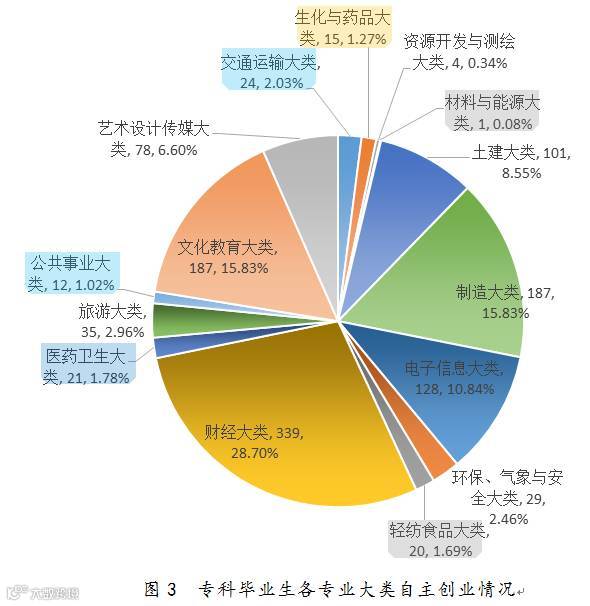 2015年专科各专业大类毕业生中,财经大类毕业生自主创业最多,有339人,占专科毕业生自主创业人数的28.70%;其次是制造大类和文化教育大类,均有187人,各占专科毕业生自主创业人数的15.83%;农林牧渔大类、水利大类和法律大类无毕业生自主创业。