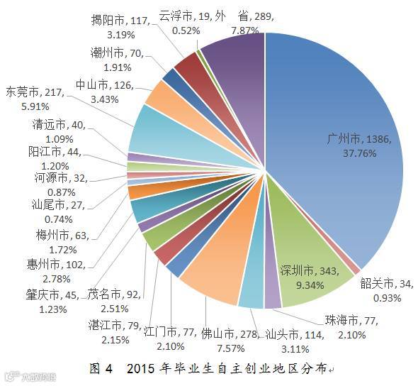 2015年自主创业毕业生中,选择在广州市创业的有1386人,占自主创业毕业生人数的37.76%;其次是深圳市,有343人,占自主创业毕业生人数的9.34%。最少的地区是云浮市,有19人,占自主创业毕业生人数的0.52%;其次是汕尾市,有27人,占0.74%。