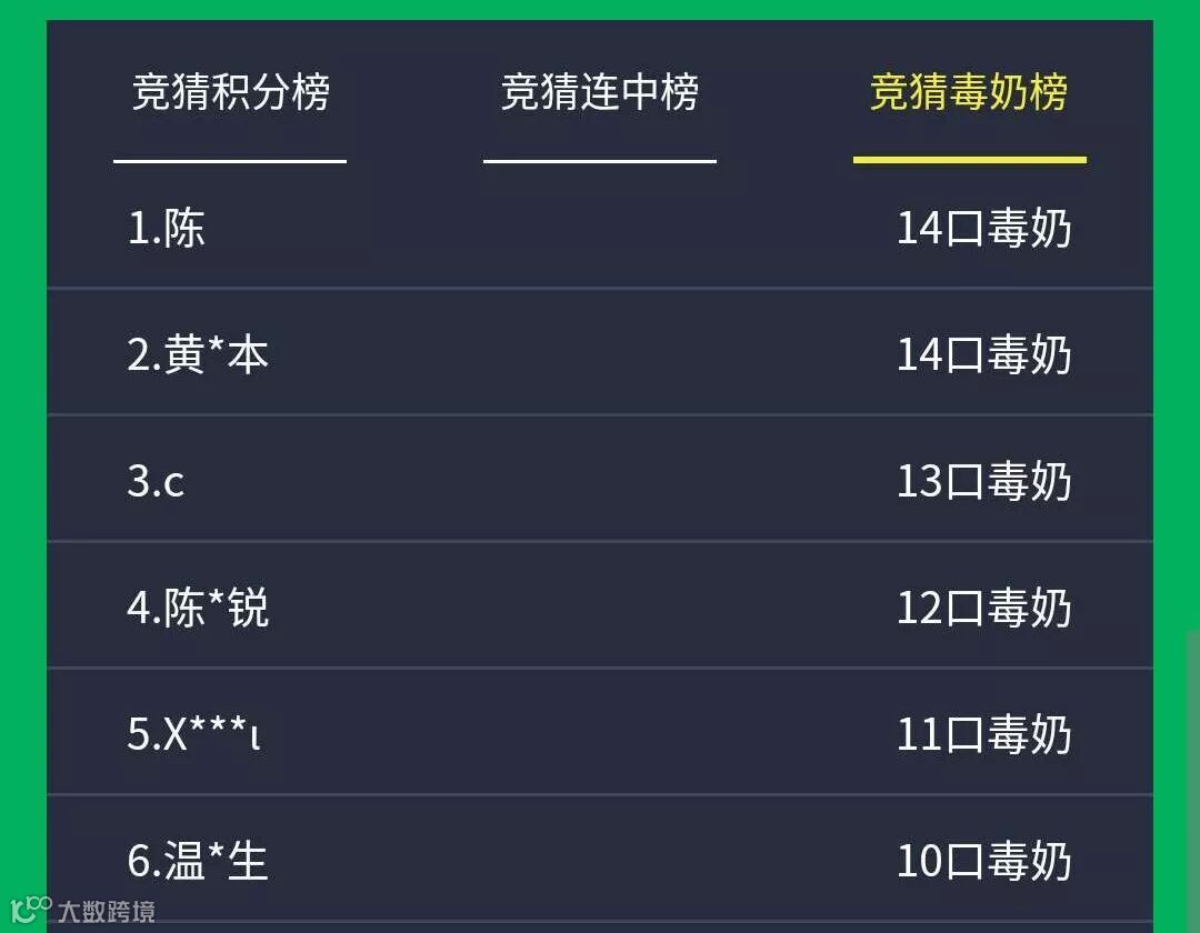 6月17日至7月15日期间竞猜错误超过五场的排名。