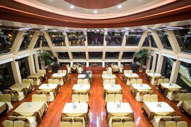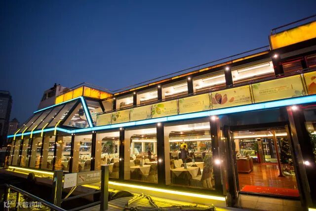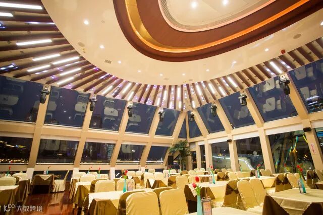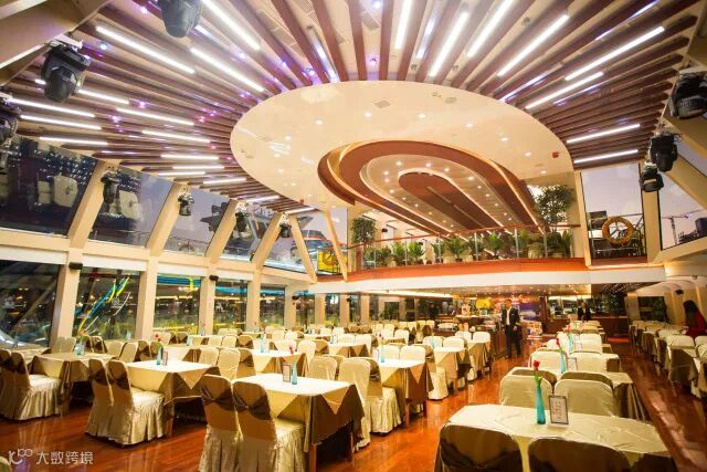 一楼大厅通透明亮,灯光配合中闪出金光,灯光透过玻璃向外漫射,游船上呈现缤纷的宝石景观。