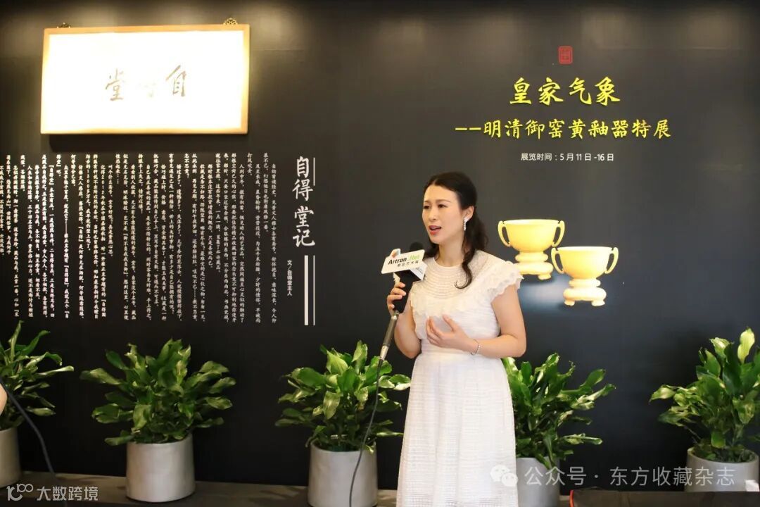 本次展览是官方和民间共同宣传推广明清御窑陶瓷文化的成功案例,是“让文物活起来”的具体表现。展品分别由景德镇中国陶瓷博物馆、景德镇市陶瓷考古研究所和自得堂三家机构提供,共展出黄釉瓷84件(套),其中自得堂堂主、著名收藏家冯玮瑜提供了她从中国嘉德等拍卖公司拍得的完整器58件(套)。多年来,冯玮瑜以一己之力,集明清历代御窑黄釉瓷器之大成,时代可靠、来源合法、流传有序,而且朝代序列基本齐全、质量优良,不仅彰显了黄釉瓷器淳和至美的艺术魅力,还诠释了器物背后的宫廷制度和皇家文化。特别是这些年,冯玮瑜通过举办展览、出版著作等方式反映明清各时期黄釉瓷器的真实面貌和发展历程,又从陶瓷工艺史、文化艺术史等多角度发掘其意义,为学术界、收藏界提供了一份珍贵的鉴研资料,起到嘉惠学林的效果。为此,本刊记者日前与冯玮瑜进行了一番深入的交流,以飨读者,望有所裨益。