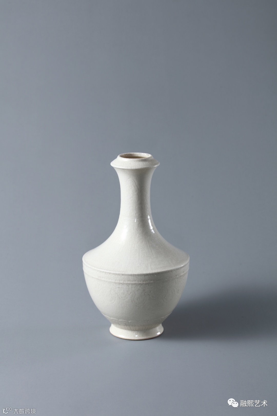 此瓶胎体轻盈细白,透明釉清亮匀净,釉面开片,古意盎然,通体剔刻纹饰,自上而下装饰卷草纹、蕉叶纹、联珠纹、回纹作为辅助纹样。肩部的主题纹饰是饕餮纹。其层次丰富,过渡清晰,颈腹部皆有一道留白弦纹凸起,与瓶口外凸的造型相呼应,纹饰繁复精细。