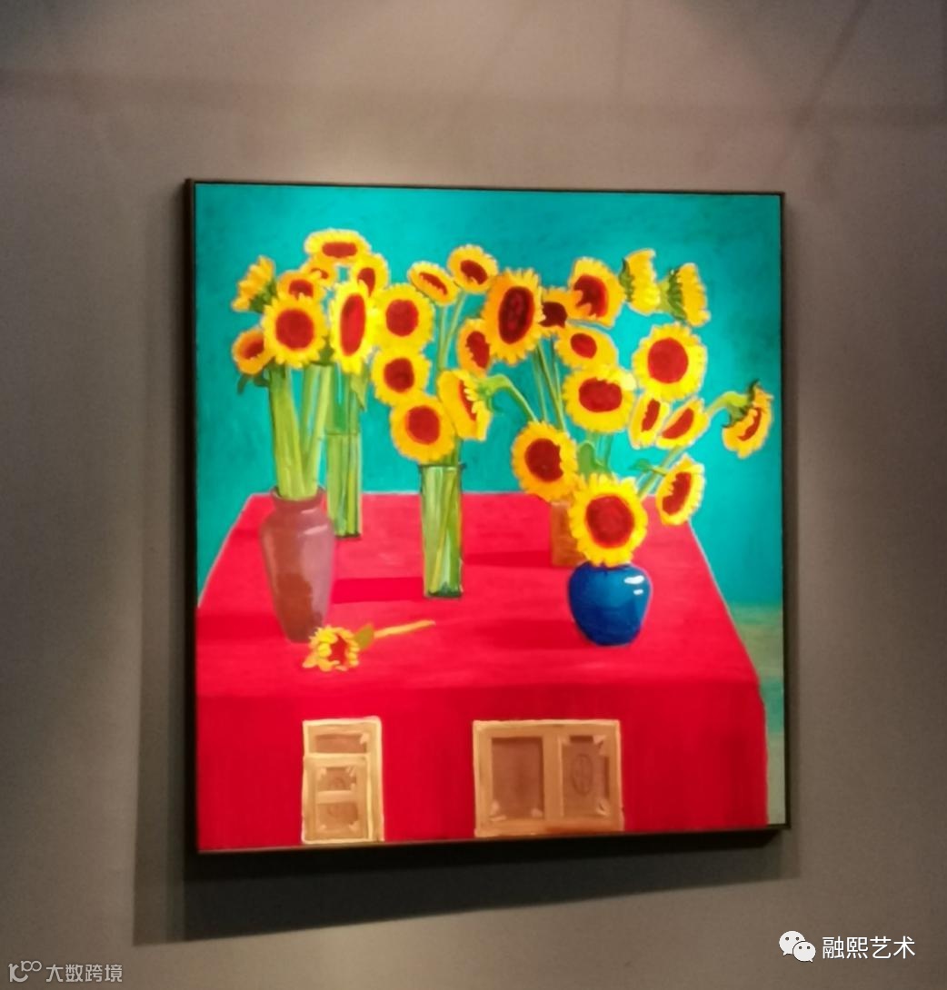 我在苏富比预展大厅这幅作品前反复欣赏,画作最夺人目光的是30朵葵花的黄色,那明晃晃的黄色,耀人眼目。