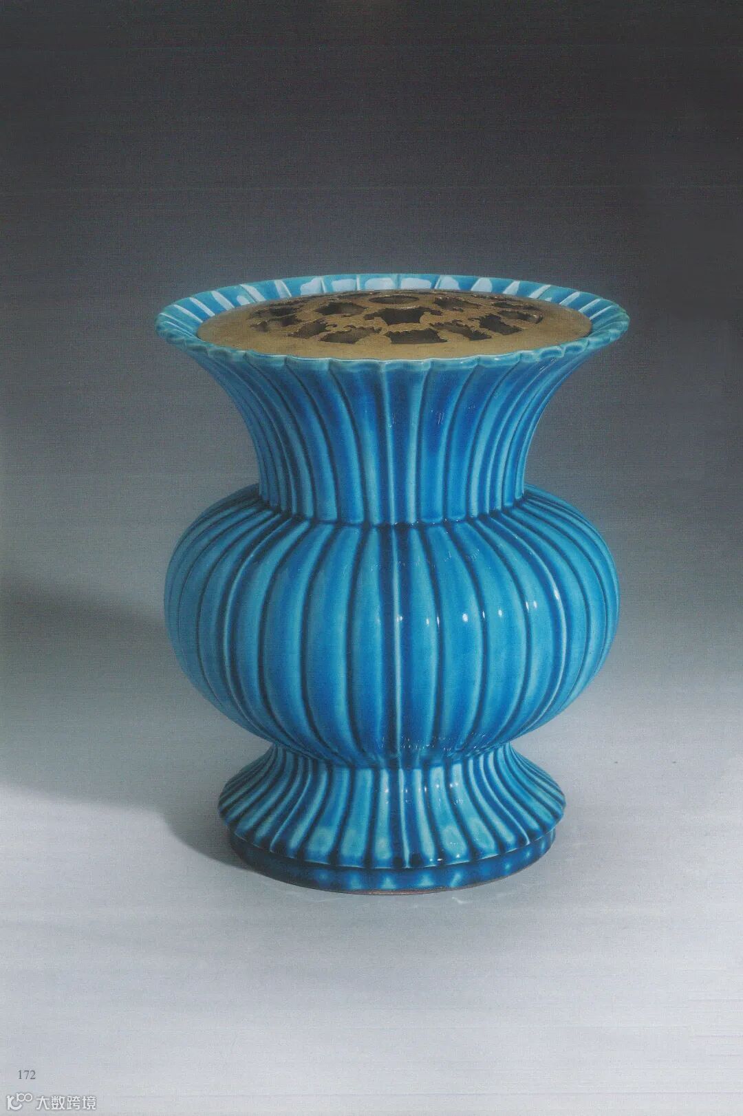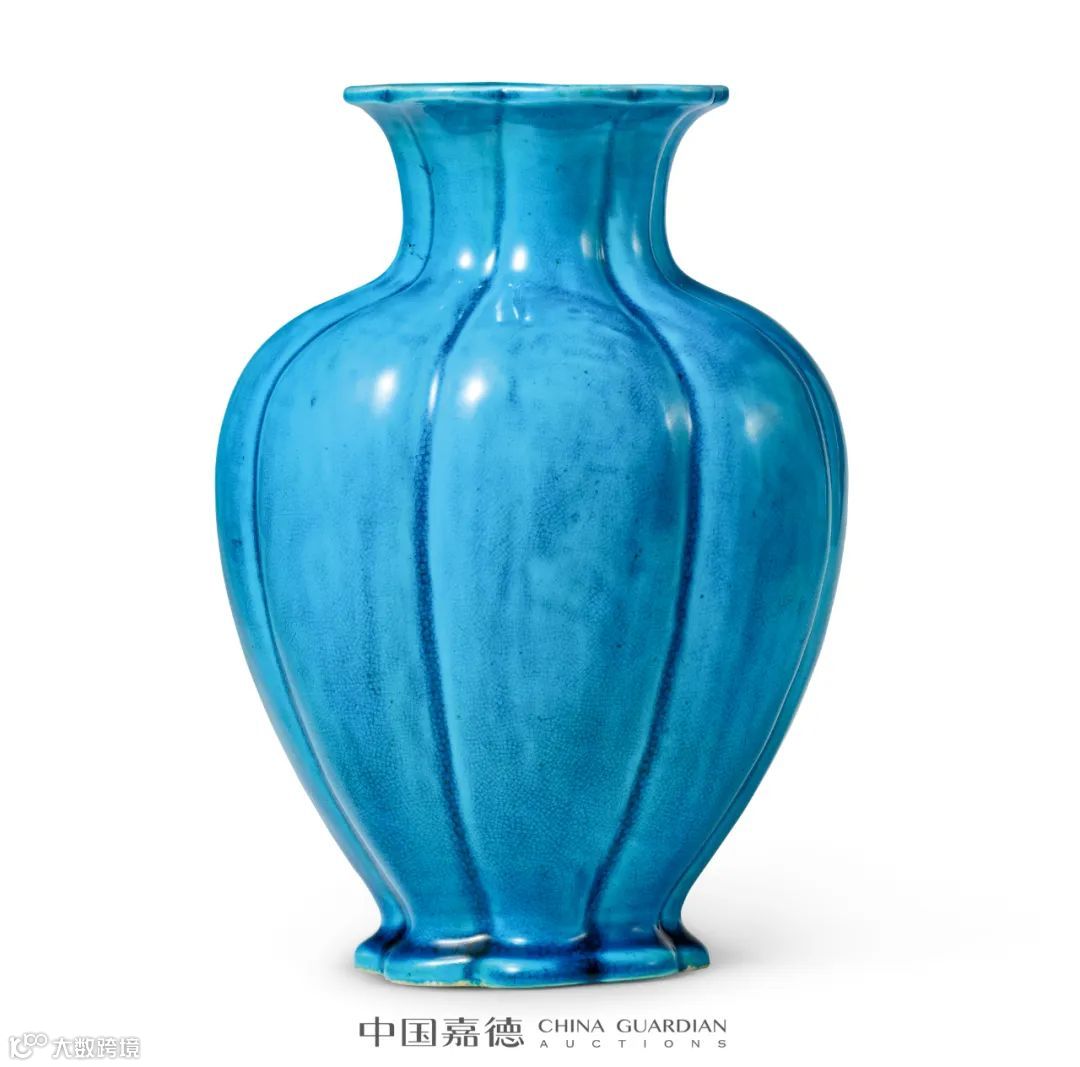本品呈瓜棱形,口随器身收缩呈盛开的花瓣形,造型端庄典雅。通体施孔雀蓝釉,玻璃质感强,釉下密布细碎冰片纹。