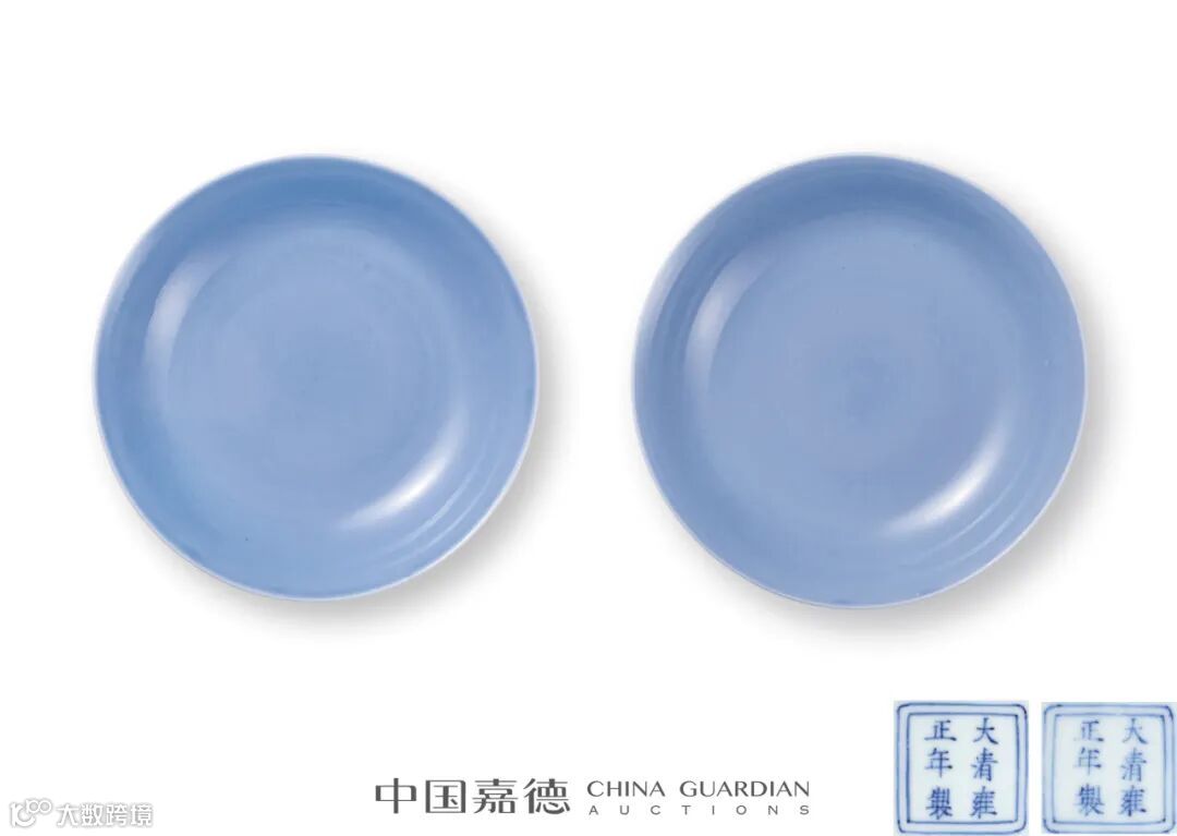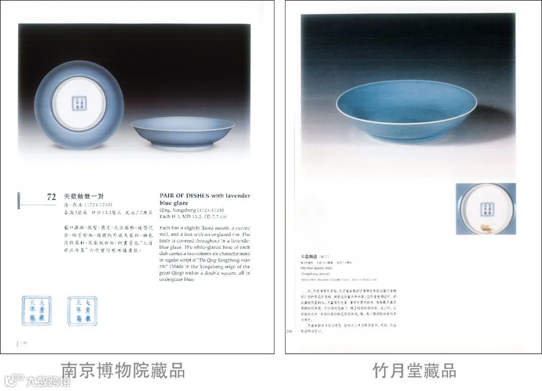 查阅资料,可知目前南京博物院藏有一例天蓝釉盘,与本品可互为参考。另,私人收藏中,可参考竹月堂主人简永桢先生收藏有一对同类器,可互为比较。在存世所见雍正朝天蓝釉盘有两类式样,一类如本品,内外皆施天蓝釉,底落六字楷书方章款;另一类内施白釉,外施天蓝釉,底落双圈楷书款,前者相对更为稀少。