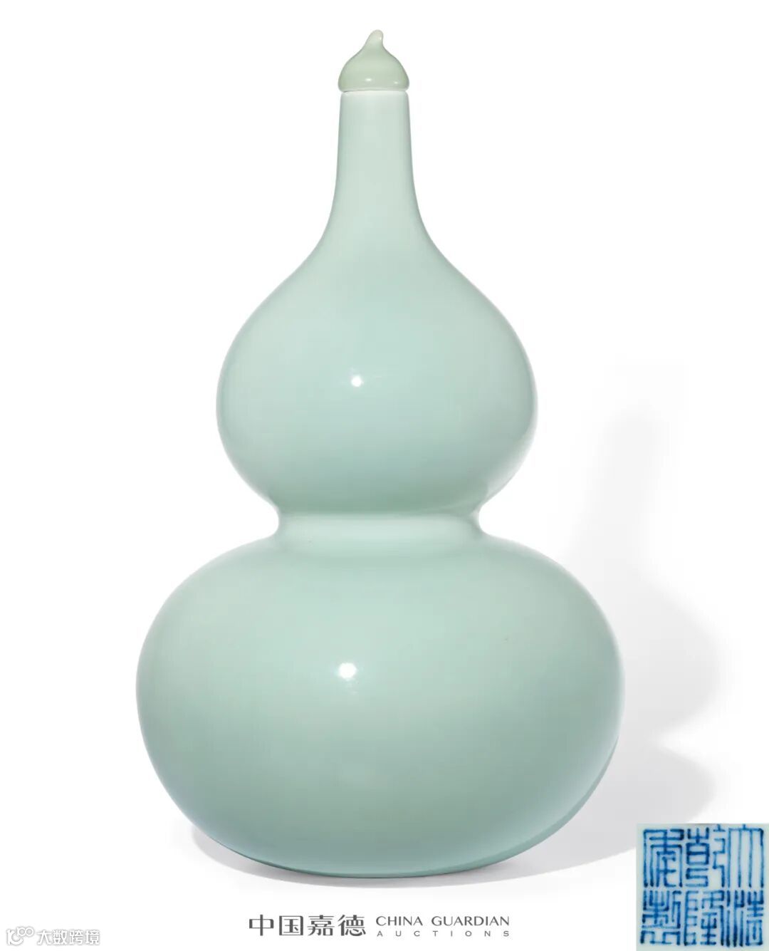 青釉在我国陶瓷史上出现最早,并作为一种最传统的品种贯穿整个中国陶瓷发展史,历经东汉、六朝、唐、宋、元直至明清不绝,清代景德镇继承龙泉青瓷的优良传统,烧出了深浅不一的各种青釉瓷器,雍正一朝达到了呈色均匀、稳定的烧造水平,乾隆时期制作技术更为稳定成熟,对于青釉的颜色控制自如,烧成了琳琅满目的青釉瓷器作品,本品即为其一。造型仿自天然葫芦之形态,瓜蒂盖,线条优美。通体外施粉青釉,釉面匀净,光润莹洁,触手如玉,釉色青幽静穆,与天然葫芦之色最为接近,惟妙惟肖,娇嫩鲜活,悦目喜人。