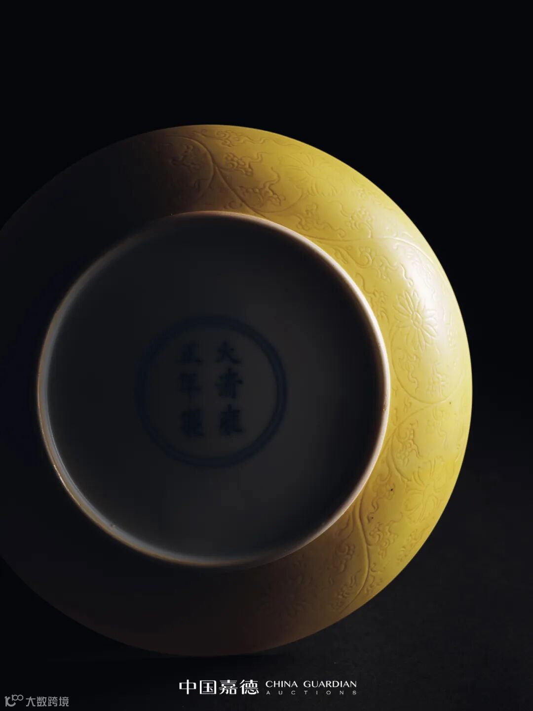 盘敛口弧腹,内外壁通体施黄釉,釉色淡雅娇嫩,外壁釉下暗刻缠枝花卉纹,花朵娇柔,枝叶婉转灵动,堪称雍正黄釉器中至纯至美者。