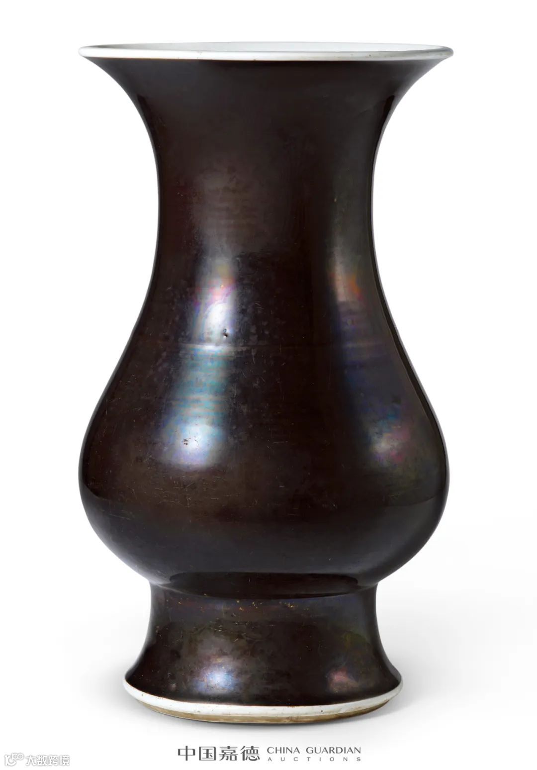 本品色泽纯黑,光华莹润,宛如黑漆髹饰而成,为典型的康熙御窑乌金釉瓷器之作。如许之衡在《饮流斋说瓷》称赞道:“乌金者黑彩之尤莹亮者也”。从其釉面隐约的痕迹可以看出其釉上曾施金彩描绘纹饰,纹饰层次繁密,而今金彩虽经年已久早已脱落,但不减其尊整体气质。此外,本品曾为清末外交家梁诚先生旧藏,值得珍视。