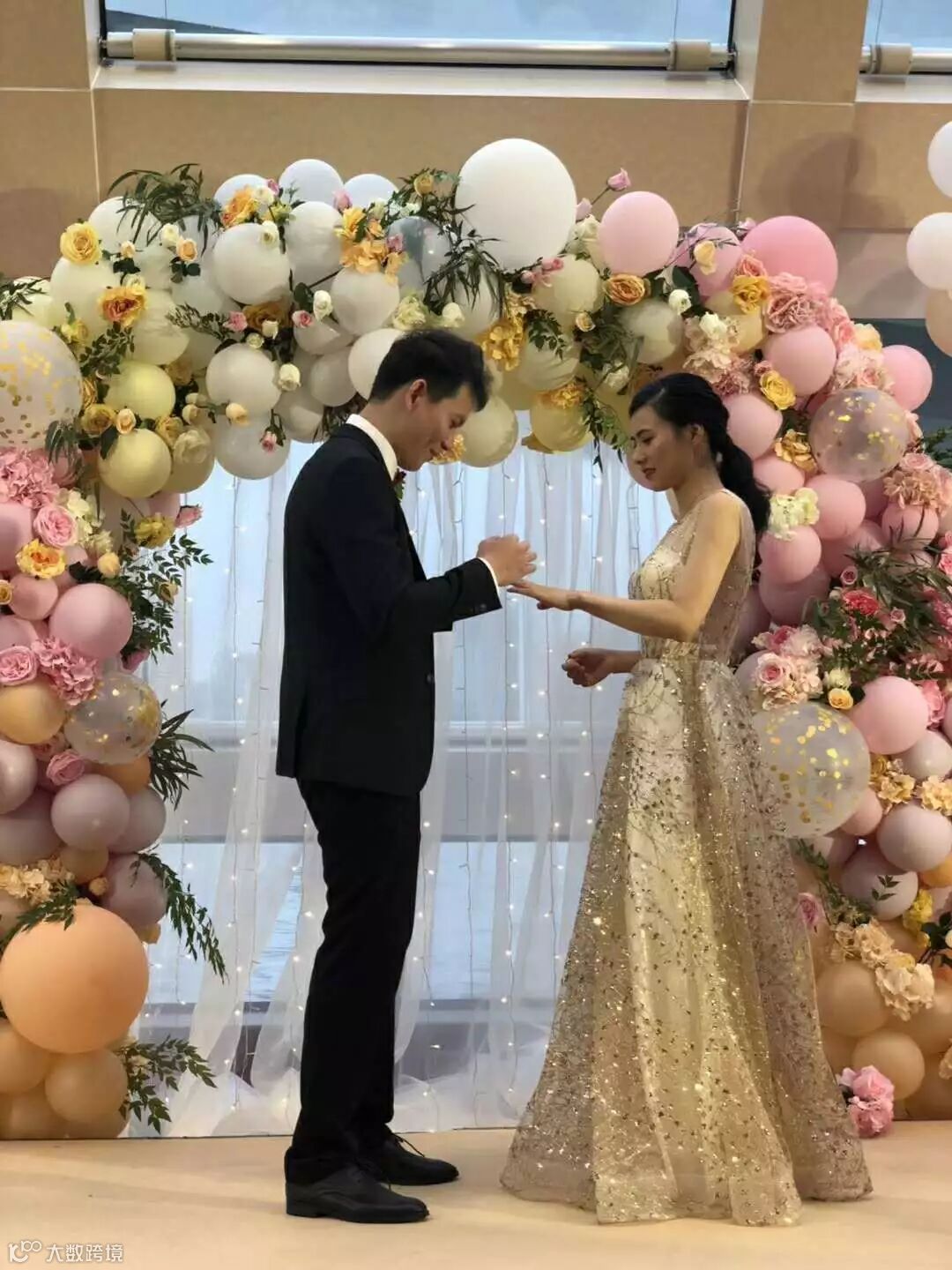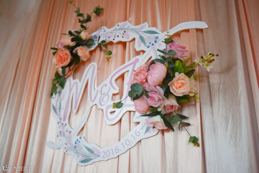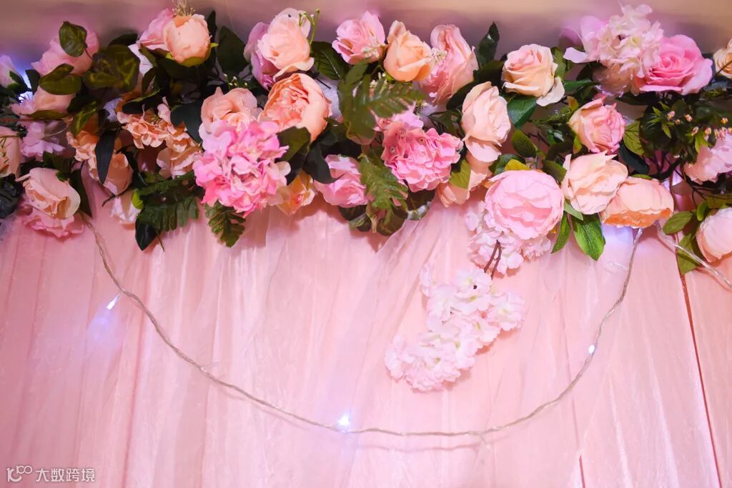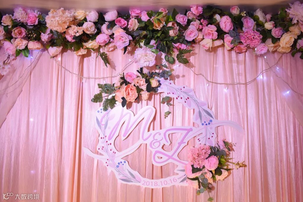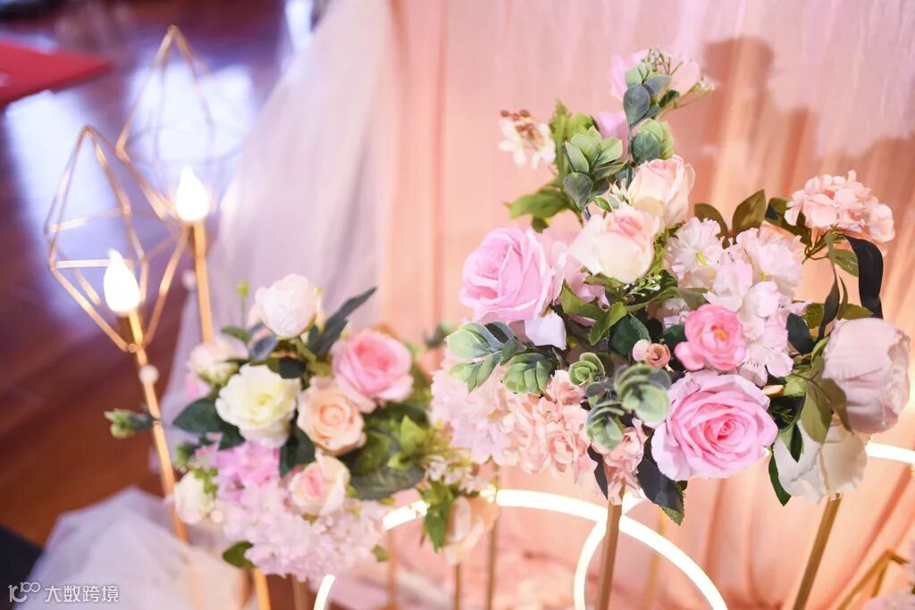 粉色布幔装饰的舞台,佐以气球和大量鲜花,在鲜花的簇拥下,以爱之名与你共赴一场今生的约定。
