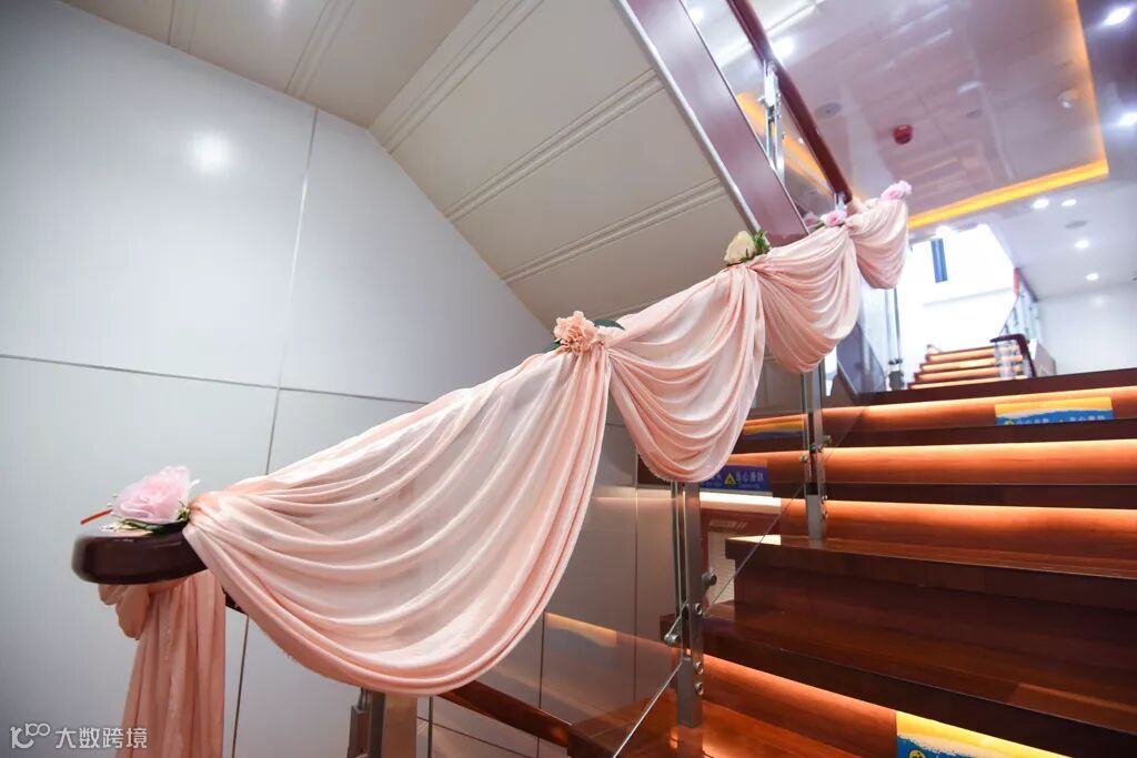 一楼高达5.3米的大厅下,唯美的西式纱幔仪式亭