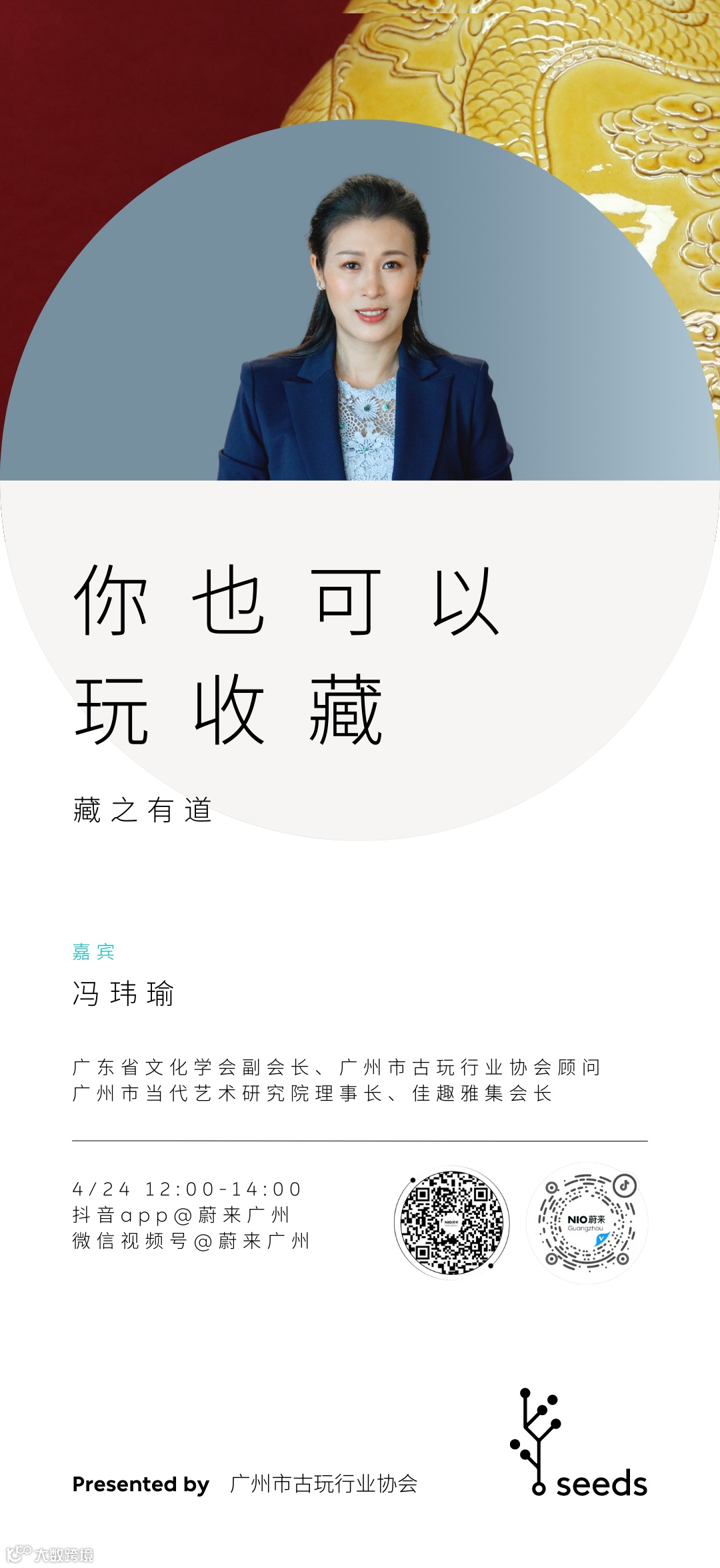 4月24日中午12:00,著名收藏家冯玮瑜做客微信视频号、抖音号@蔚来广州直播间,将瓷器古玩的制作工艺、典故历史娓娓道来,并分享10年全球顶级拍卖会的经验故事和收藏规律,举牌之间,得与失,悲与喜,不仅在一念之间,而是她的格局眼界、周全思考下的决断。