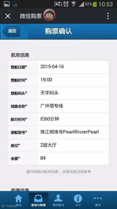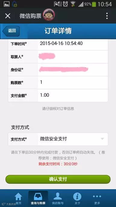 注册成功后返回到购票确认页面,如果不需要注册则会直接进入这个页面,支付方式为微信支付,订单有效期为10分钟,如果逾期未付款,订单将会自动取消