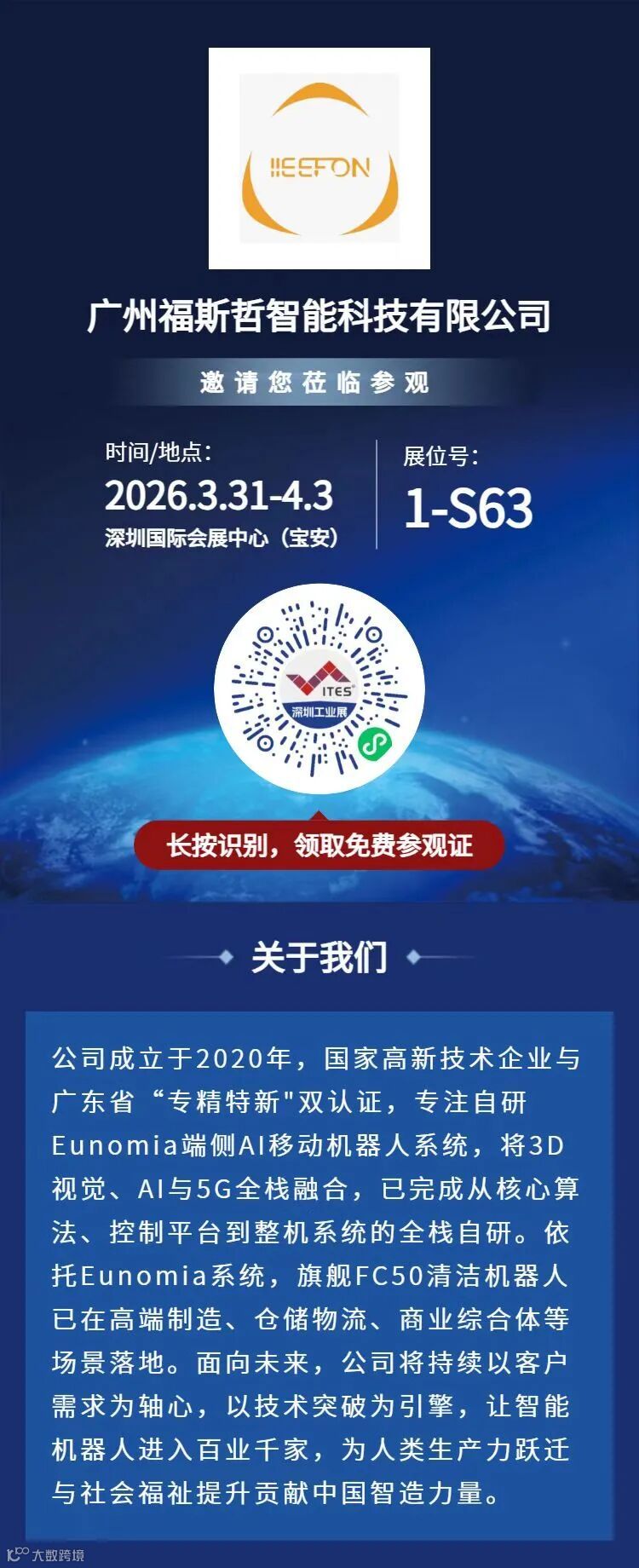 2026年3月31日至4月3日,深圳工业展将在深港国际会展中心(宝安)举行。福斯哲将携全栈自研的Eunomia端侧人工智能移动机器人系统,以及旗舰产品FC50清洁机器人,在1-S63展位亮相。