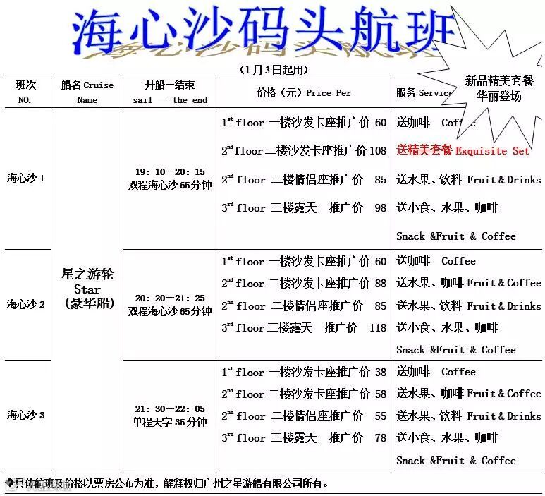 珠江夜游指定航班,加1元即可在7天内任一天无限次免费乘坐广州有轨电车。