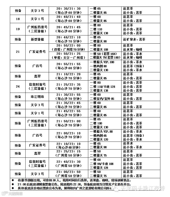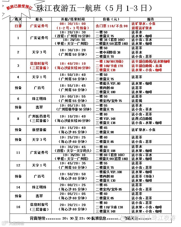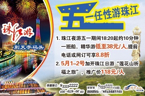 五一航班已经开始接受预订喽!5.1-3号 珠江夜游18:20起约十分钟一班船,5.1-2号 加开“珠江日游莲花山祈福之旅”,提前电话或者网订还有8.8折优惠哦~
