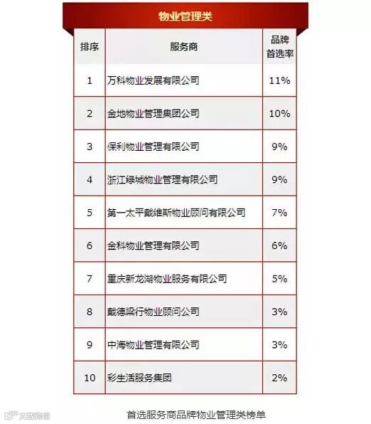 据了解,该发布会发布了2015中国房地产开发企业500强榜单,同时也发布了首选服务商品牌,其中物业管理类共列出十大物业品牌企业,分别是万科物业、保利物业、绿城物业、第一太平戴维斯物业、金地物业、金科物业、重庆新龙湖物业、戴德梁行物业、中海物业、彩生活服务集团,万科物业仍然是物业管理行业老大,彩生活服务集团在前十名中垫底。十名品牌首选率分别是11%、10%、9%、9%、7%、6%、5%、3%、3%、2%。