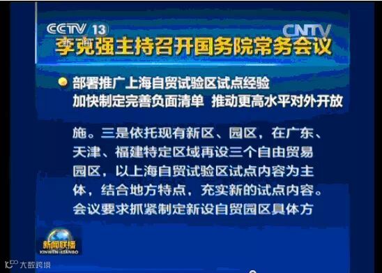 会议指出,中国(上海)自由贸易试验区设立一年多来,围绕外商投资负面清单管理、贸易便利化、金融服务业开放、完善政府监管制度等,在体制机制上进行了积极探索和创新,形成了一批可复制、可推广的经验做法。党中央、国务院已决定在更大范围推开,推动实施新一轮高水平对外开放。会议要求,一是深化上海自贸试验区改革开放,进一步压缩负面清单,在服务业和先进制造业等领域再推出一批扩大开放举措,并将部分开放措施辐射到浦东新区。二是除涉及法律修订等事项外,在全国推广包括投资、贸易、金融、服务业开放和事中事后监管等方面的28项改革试点经验,在全国其他海关特殊监管区域推广6项海关监管和检验检疫制度创新措施。三是依托现有新区、园区,在广东、天津、福建特定区域再设三个自由贸易园区,以上海自贸试验区试点内容为主体,结合地方特点,充实新的试点内容。会议要求抓紧制定新设自贸园区具体方案,并提请全国人大常委会授权调整实施相关法律规定。