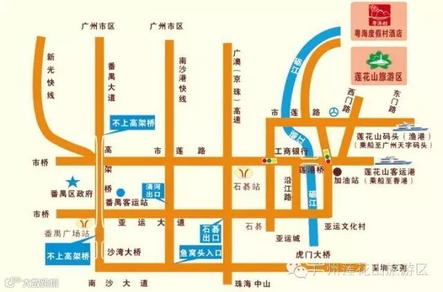 广州地区方案:广州市科韵路入口,经南沙港快速路至亚运城出口站下,沿亚运大道往东行驶约8公里,到达莲花山。