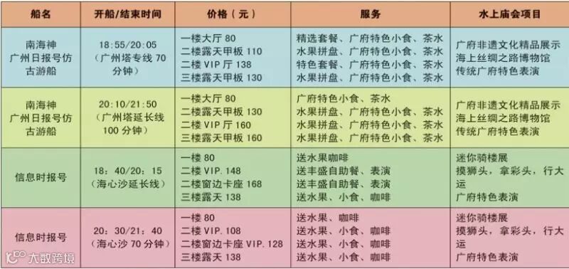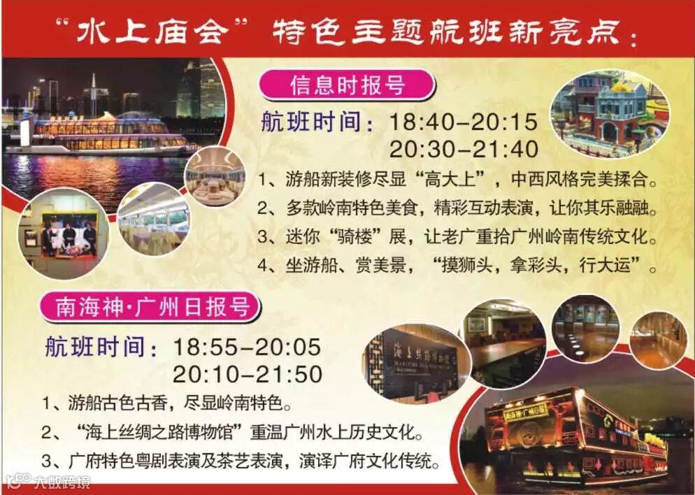 此次“水上庙会”是在第一届的基础上进行创新及增加新元素。将推出以“南海神号”仿古船及“信息时报船”现代豪华船为主打的多个主题航班,中西揉合,特色广庙元素,精彩表演,让您领略不一样的珠江夜游。
