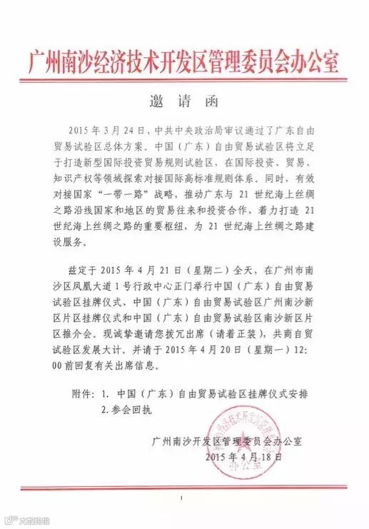 随着国新办新闻发布会的消息传出,很快有网传消息称,备受关注的广东自贸区挂牌仪式将于4月21日(周二)在南沙举行。文中称消息来源为南沙开发区管委会办公室,并附上了南沙开发区管委会办公室的红头文件邀请函,并附有当天详细行程。广东省委书记胡春华,将为自贸试验区揭牌。香港行政长官梁振英、澳门行政长官崔世安等,亦将出席揭牌仪式。