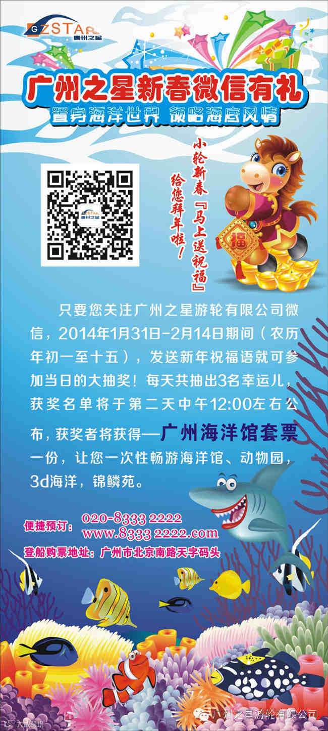 马上送大礼,即日关注小轮,即可参与新春期间的“说祝福换大礼”的抽奖活动,凡是本微信的粉丝,在2014年1月31日到2014年2月14日期间,即新春初一到十五,只要发送自己的新年祝福或者愿望给小轮,小轮则会在每天发送祝福的亲当中随机抽选三位幸运粉丝获得“广州海洋馆套票”一份,中奖的名单则会在次日的中午12:00通过小轮发送,请届时务必关注。