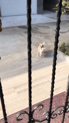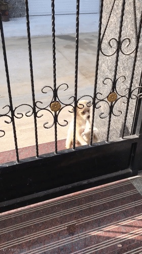 有这么一只汪麻麻打算带娃回窝,可回窝途中遇到了一个铁门阻拦: