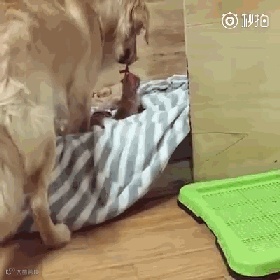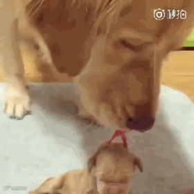 还有网友家的这只大金毛,也是第一次当妈没经验,不知道该怎么叼宝宝: