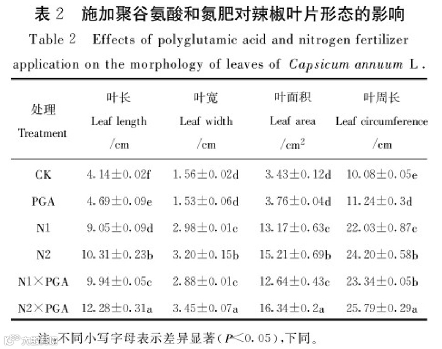 N1×PGA、N2×PGA交互处理均显著提升叶片各项形态指标,N2×PGA处理使叶长、叶宽、叶面积、叶周长均达到最大值,叶面积增幅达376.38%(P<0.05),说明高氮与聚谷氨酸配施可显著促进辣椒叶片生长,扩大光合面积。