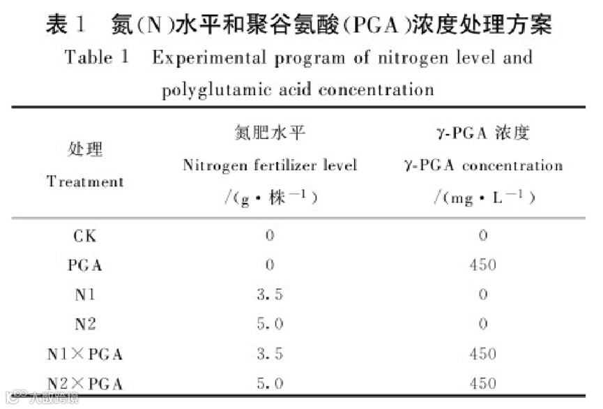 试验设置3种氮肥用量:不施加氮肥施、中氮3.5g/株、施高氮5g/株;2种聚谷氨酸喷施量:不喷施聚谷氨酸并以清水代替喷、施聚谷氨酸(50mg/L)试验所用氮肥类型为尿素,每种施氮处理分量施加3次,以溶液形式施加,同时每个处理配施相同量磷肥、钾肥和微量元素肥。