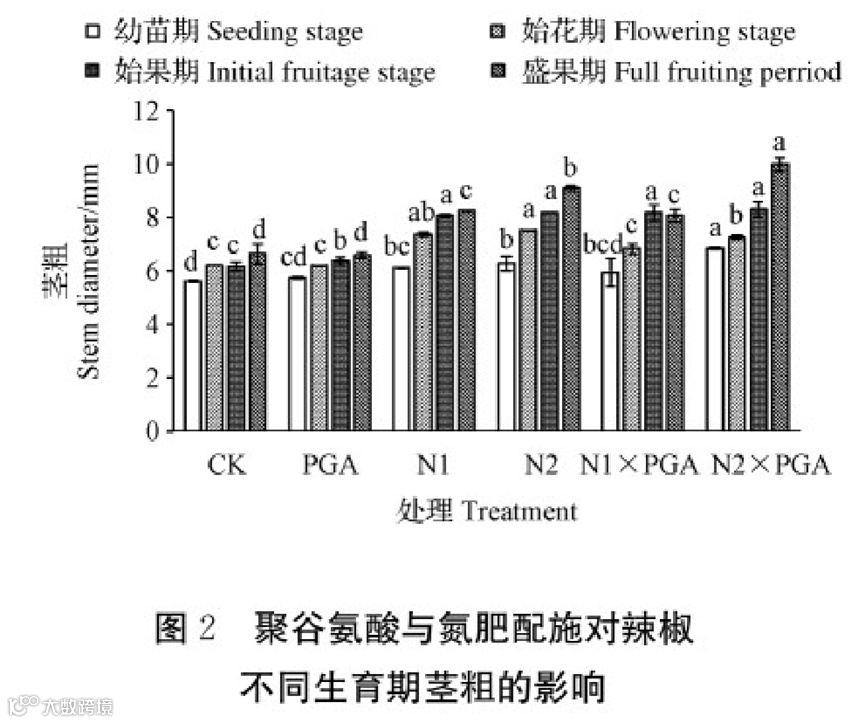 N1×PGA、N2×PGA交互处理均显著提升各生育期茎粗,N2×PGA处理使幼苗期、始果期、盛果期茎粗达到最大值,盛果期增幅达49.95%(P<0.05),表明高氮与聚谷氨酸配施对辣椒茎粗的促进效果最佳。