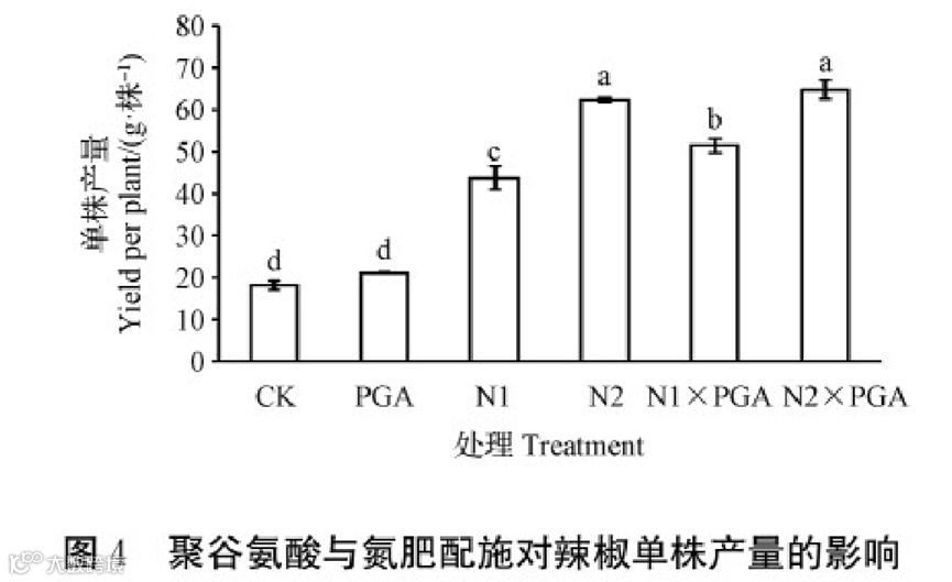 单独喷施聚谷氨酸对辣椒单株产量无显著影响;N1、N2处理均能显著提升单株产量,增幅分别为142.37%、245.76%(P<0.05);
