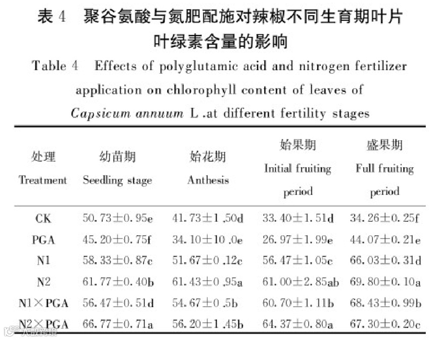 与对照相比,单独喷施聚谷氨酸显著降低辣椒各生育期叶绿素含量;N1、N2处理均能显著提高各生育期叶绿素含量,其中N2处理盛果期叶绿素含量增幅最高,达103.74%(P<0.05);