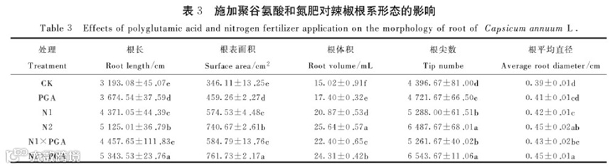 单独喷施聚谷氨酸可显著增加辣椒总根长、根表面积、根尖数、根体积,增幅分别为15.08%、32.69%、7.39%、15.85%(P<0.05);