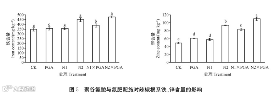 单独喷施聚谷氨酸对辣椒根系铁、锌含量无显著影响;N1处理对根系铁含量无显著影响,但显著增加根系锌含量,增幅为17.39%(P<0.05);N2处理显著提升根系铁、锌含量,增幅分别为29.47%、88.74%(P<0.05);