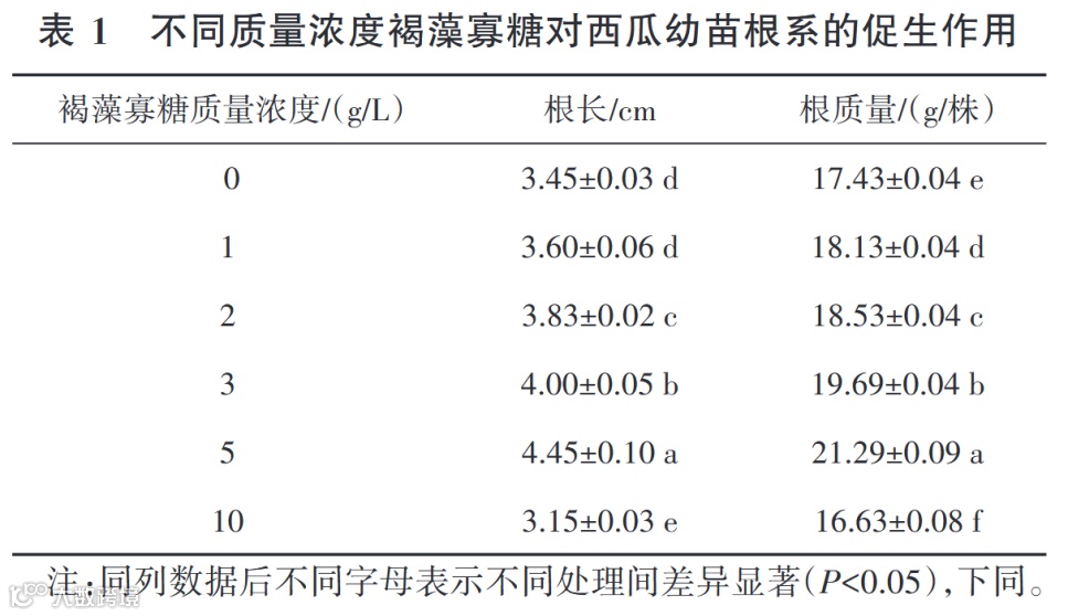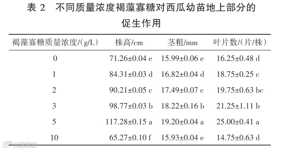 说明一定质量浓度的褐藻寡糖对西瓜幼苗地上部分有一定的促生作用,以5g/L褐藻寡糖效果最明显;而10g/L褐藻寡糖对西瓜幼苗地上部分生长有一定程度的抑制作用。