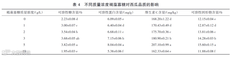说明一定质量浓度的褐藻寡糖对西瓜品质有改善作用,以5g/L褐藻寡糖效果最明显;而10g/L褐藻寡糖会降低西瓜品质。
