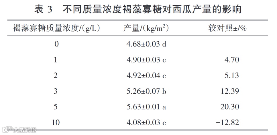 说明一定质量浓度的褐藻寡糖对西瓜有增产作用,以5g/L褐藻寡糖效果最明显;而10g/L褐藻寡糖对西瓜有减产作用。