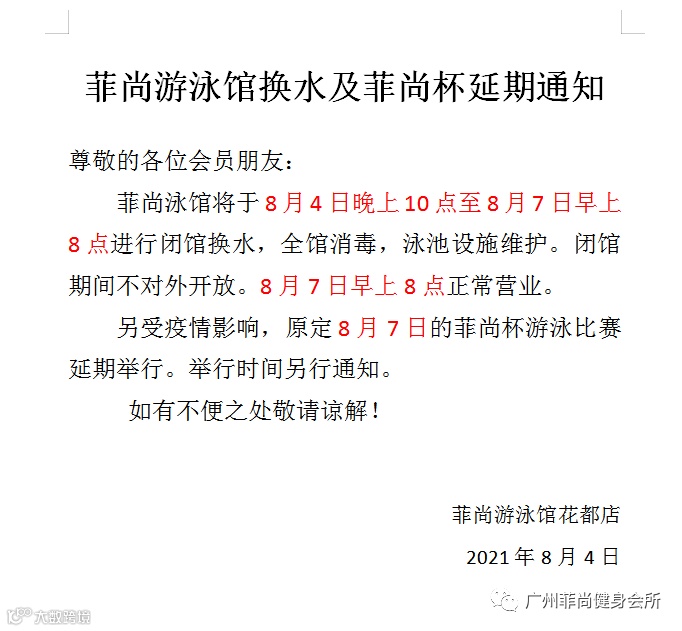 菲尚泳馆将于8月4日晚上10点至8月7日早上8点进行闭馆换水,全馆消毒,泳池设施维护。闭馆期间不对外开放。8月7日早上8点正常营业。