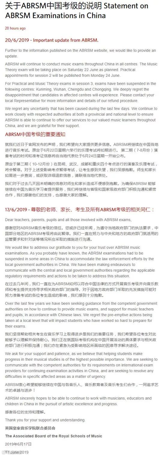 重磅消息!英皇官网发布消息,停止中国境内的考级考试。在声明中提到暂停原因为:需适应我国政府的相应法规。