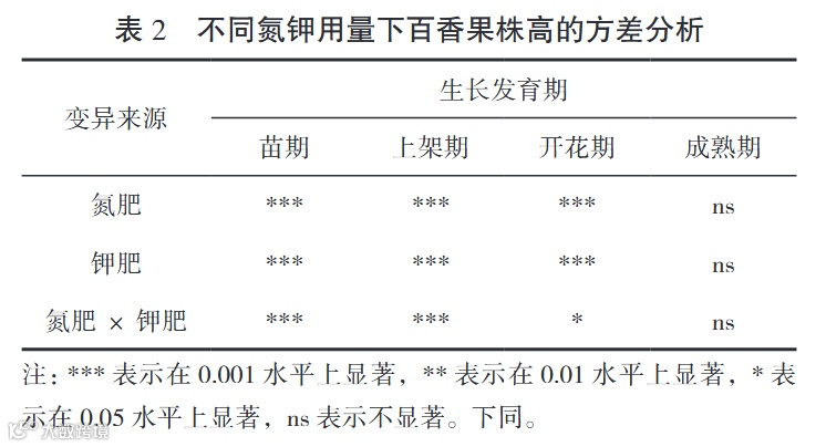 结合表2可知,在苗期至开花期,不同氮钾用量对百香果株高具有极显著影响,且两者之间存在显著的交互作用;成熟期时,各处理间则无显著差异。