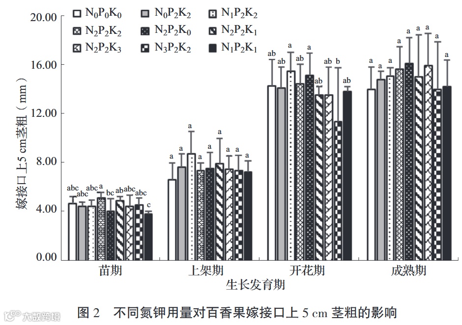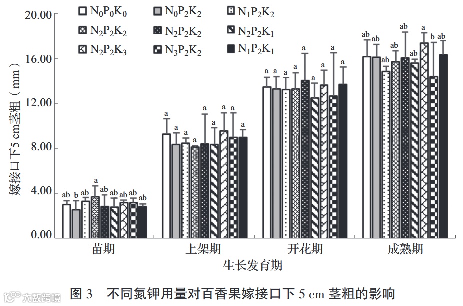 成熟期时,各处理的百香果嫁接口茎粗均无显著性差异。百香果嫁接口上5cm茎粗在上架期到开花期间增长速度最快,而嫁接口下5cm茎粗在苗期到上架期间增长速度最快;但在同一时期内,各施肥处理的百香果嫁接口上下5cm茎粗与N0P0K0相比均无显著性差异。
