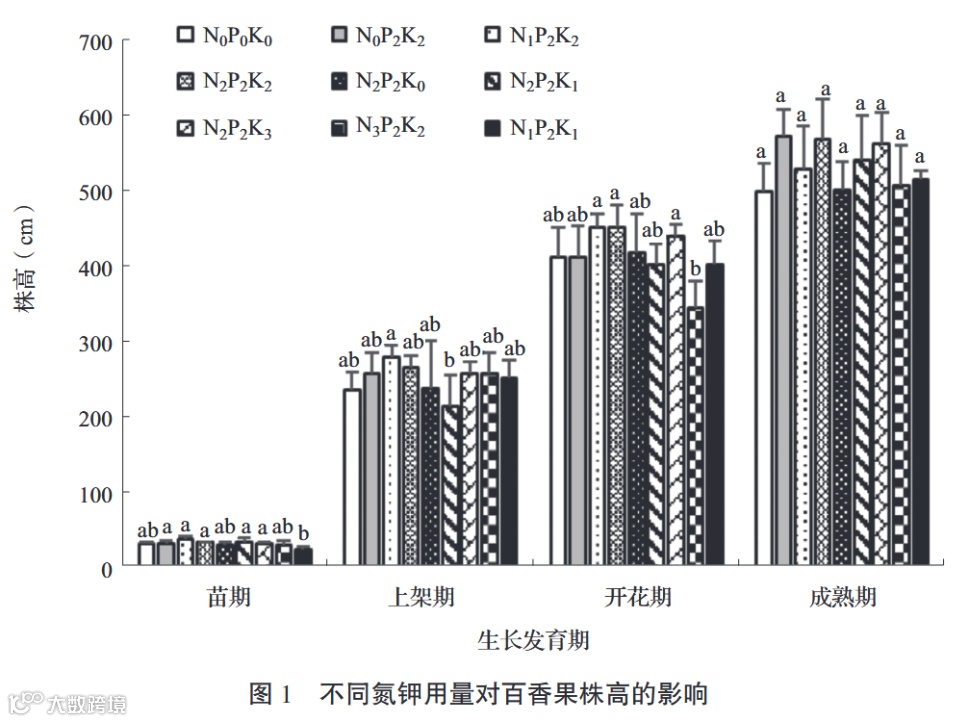 在上架期,N1P2K2处理的百香果株高显著高于N2P2K1处理;在开花期时,比较N1P2K2、N2P2K2和N3P2K2处理发现,百香果株高随着氮肥用量的增加呈先增加后降低的趋势,在N2水平的时候株高增长最快(452m);成熟期时,各处理间株高均无显著差异。