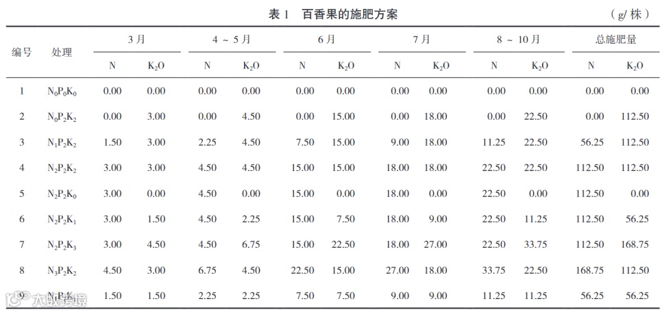 基于肥料试验实施方案,将磷(P2O5)的施肥水平固定,设置氮(N)、钾(K2O)2个因素,4个不同施肥水平(分别用0、1、2、3水平代替)。0水平为不施用任何肥料;2水平是当地百香果的常规施肥量,1水平是2水平施用量的一半;3水平为2水平施用量的1.5倍。由此得出9个不同水平组合。